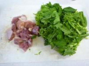 ![]() 菜の花は洗って、3等分に切ります。鶏肉はひと口大に切ります。