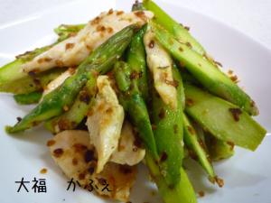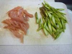 ![]() ササミはひと口大の薄切りにします。アスパラは洗って、薄めの斜め切りにします。