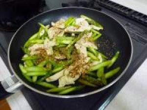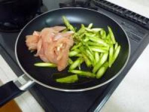 ![]() フライパンに、オリーブオイルをひいてササミとアスパラを炒めます。