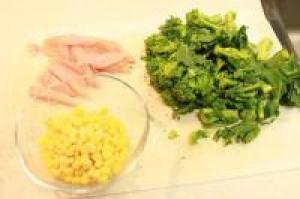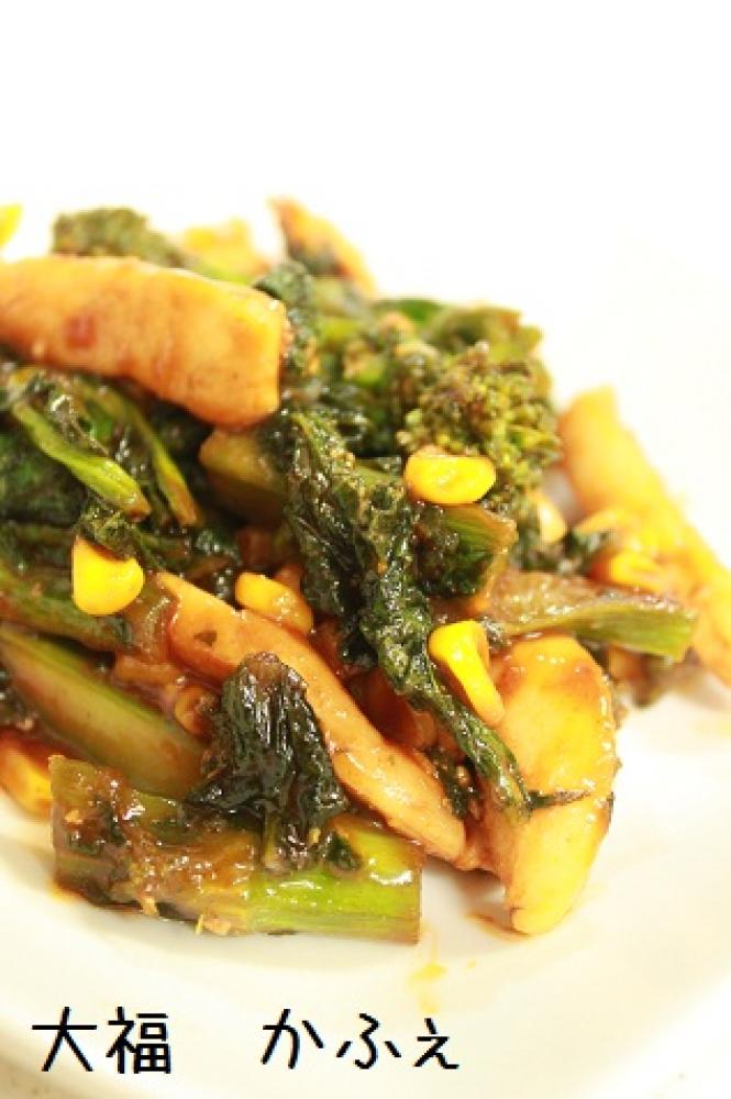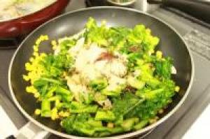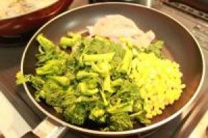 ![]() フライパンに油をひいて、菜の花、鶏ササミ、冷凍コーンを炒めていきます。