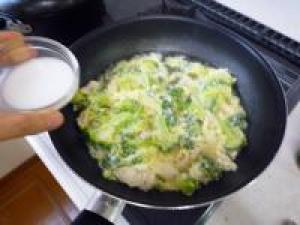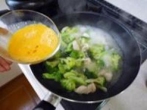 ![]() ササミ、ブロッコリーに火がとおったら溶き卵を加えて素早くかき混ぜます。