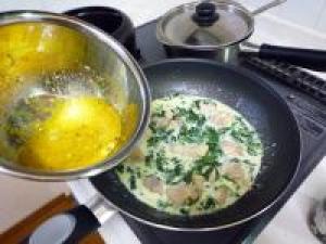 ![]() フライパンにバター、鶏肉、ほうれん草を入れて鶏肉に火がとおるまで炒めます。