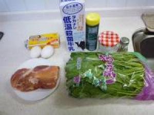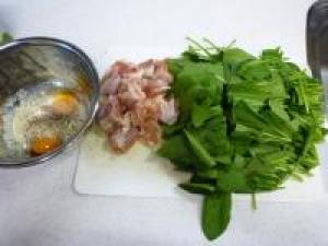 ![]() 鶏は一口大の大きさに切ります。ほうれん草は洗って茎を切り落とし3等分位い切ります。