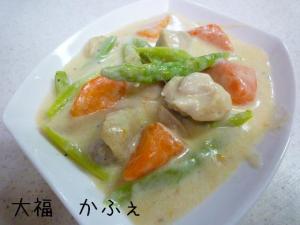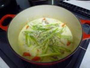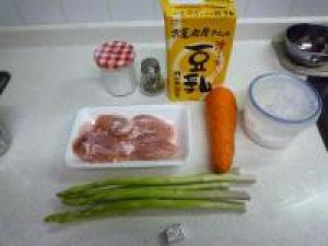 ![]() 鶏肉と人参に火がとおったら、豆乳、アスパラ、塩、コショウを入れてアスパラに火がとおったら・・・
