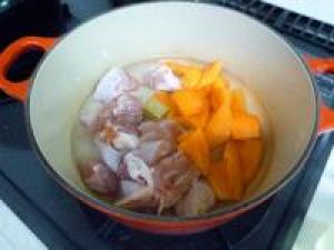 ![]() 鍋に鶏肉、人参、コンソメキューブ、水200ccを入れて弱火~中火で煮ていきます。途中、灰汁が出たら取り除いてください。