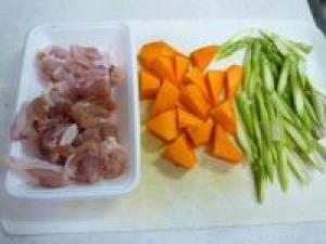 ![]() 鶏肉は食べやすい大きさに切ります。人参は両端を切り落とし皮をむいて一口大の乱切りにします。