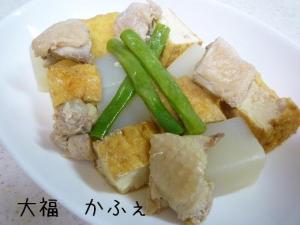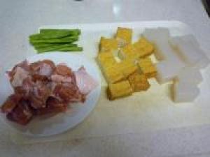 ![]() 鶏肉、厚揚げ、こんにゃくは一口だいに切ります。いんげんは半分にきります。