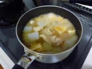 ![]() 鍋に鶏肉、厚揚げ、こんにゃく、水400ccを入れて火にかけます。