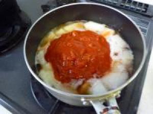 ![]() さらに、沸騰したらトマト缶、砂糖、塩を加えて煮ていきます。中火くらいで。
