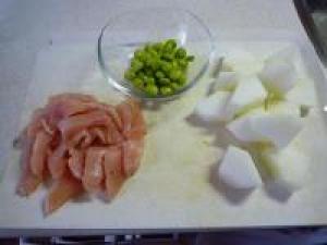 ![]() 鶏肉は皮を取り除いて、一口大のそぎぎりにします。