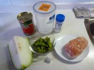 ![]() とうがんは皮をむいて、種の部分を取り除き食べやすい大きさに切ります。枝豆は殻から出しておきます。