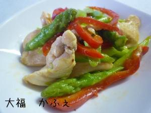 ![]() 鶏肉に火が通ったら、アスパラ、パプリカをいためます。