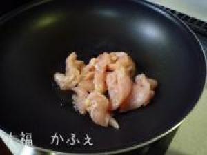 ![]() フライパンにオリーブオイルを入れて、鶏肉を炒めます。