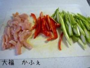 ![]() アスパラは斜め切りに、パプリカは千切りに、鶏肉は皮を取り除いてそぎぎりに。