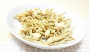 Aに火が通ってきたらBを加えてさらに炒め、Dで味をつけ、材料に火が通るまで炒めて出来上がり。