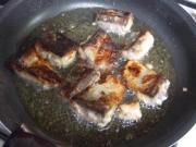 ![]() 1の鯖に米粉をまぶし、油(分量外)を多めに入れたフライパンで炒め揚げする。