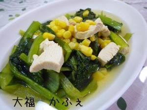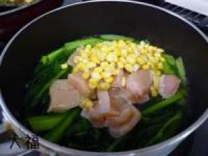 ![]() 小松菜が煮えたところで、鶏肉、コーンを加えます。
