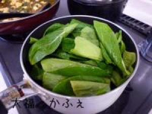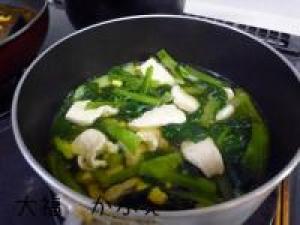![]() 鍋に水400ccを入れて、小松菜を入れ火にかけます。