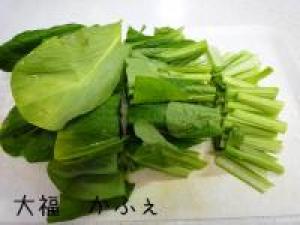![]() 小松菜は洗って、茎の部分は切って捨て、残りはざく切りに。