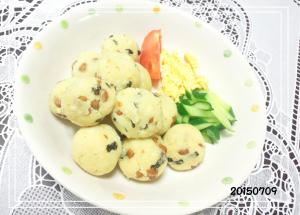混ぜ合わせたBをAに加え良く混ぜ合わせて、食べやすい大きさに丸め、耐熱皿に並べ蓋をし、レンジで火が通るまで加熱する。