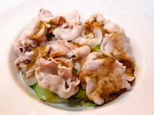豚肉は熱湯で茹でて色が変わったら冷水にとり、ザルに上げて水けをきります。 |