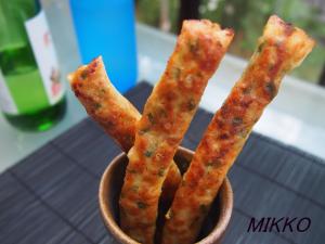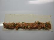![]() 春巻きの皮を横向きに置き、向こう側の端にのりをつける。手前に細長く1のたねを乗せ、くるくる巻く。