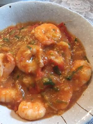 5にトマトを入れつぶしながら炒め、醤油、砂糖、水で溶いた鶏がらスープを加えて煮詰める。