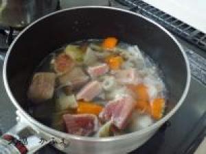 ![]() 水400ccと蓮根と人参をいれて、沸騰するまで煮ます。沸騰したら、鶏肉と残りの調味料を入れて・・・・・・・