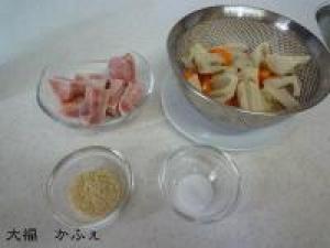 ![]() 蓮根と人参は皮をむいて乱切りにします、