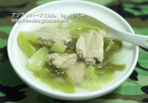 鍋に水とスペアリブを入れて中火にかけ、沸騰したら切った高菜を入れて弱火で30分ほどコトコト煮込みます。