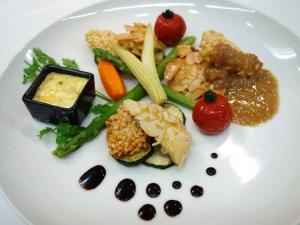 アスパラ、ヤングコーンを下ゆでし、ズッキーニは塩こしょうしてオリーブオイルで焼く。 |