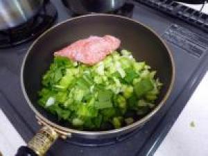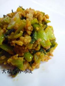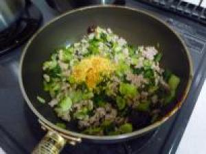 ![]() フライパンに豚挽肉、チンゲン菜を入れて炒めます。
