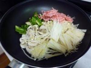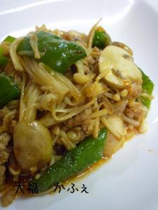![]() フライパンに油をひいて、豚挽き、エノキ、マッシュルーム、ピーマンを入れて炒めていきます。