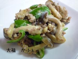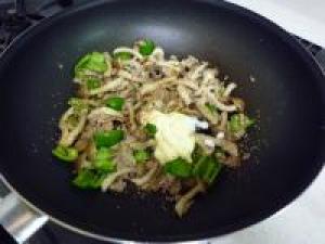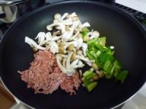 ![]() フライパンに豚挽き、しめじ、ピーマンを入れて炒めます。