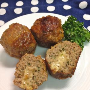 肉だねを丸め、ベビーチーズを中に押し込み形を整える。チーズを入れられるよう大きめに肉だねを15〜16等分して作ります。