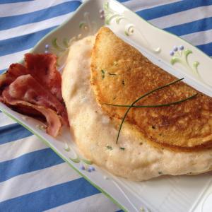 卵は卵黄と卵白にわける。チャイブ(あさつき)はみじん切りにする。つけあわせのベーコンは先に焼いておく。