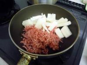 ![]() フライパンに豚挽き肉、長イモをいれて中火で炒めていきます。