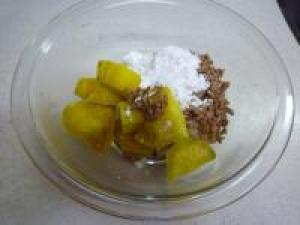 ![]() 煮たサツマイ、炒めた豚挽肉、片栗粉を入れてこね合わせます。