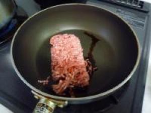 ![]() フライパンに豚ひき肉と醤油を入れて炒めます。