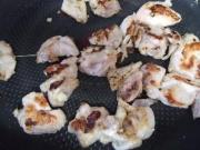 ![]() フライパンにごま油、にんにく、しょうがを弱火で熱し、香りが出たら、中火から強火で鶏肉を焼く。焦げないように火加減。