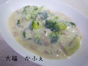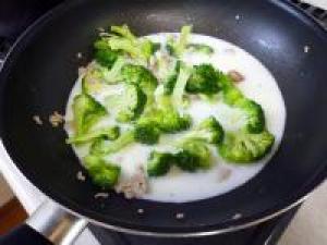 ![]() 豚挽きに火がとおったら、水100cc、牛乳、コンソメを入れてブロッコリーに火がとおるまで煮ます。