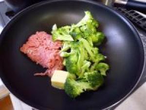 ![]() フライパンか鍋にバター、豚挽き、ブロッコリーを入れていためます。