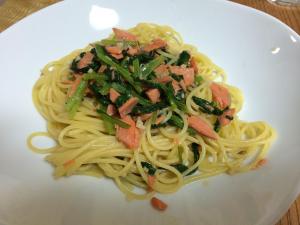 オリーブ油をフライパンに熱し、にんにく、塩鮭を炒めます。