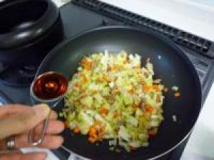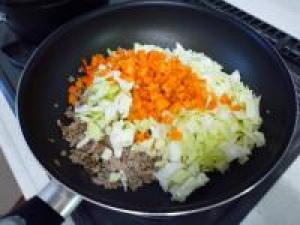 ![]() 豚ひきがいたまったら、キャベツ、人参を加えてさらに炒めていきます。