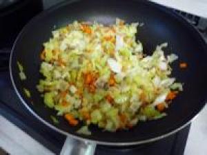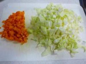 ![]() 人参は皮をむいてみじん切りに、キャベツは粗みじん切りに切ります。