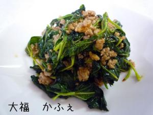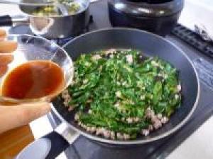 ![]() ひきがいたまったら、油を加えてモロヘイヤを入れてさらに炒めます。