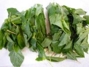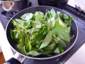 ![]() モロヘイヤは茎から外して洗って、3等分くらいにざく切りにします。