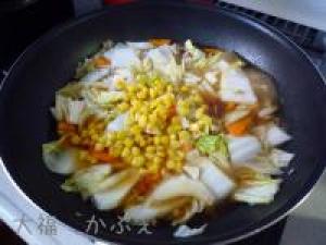 ![]() 沸騰してきたら、冷凍コーン、砂糖、醤油、お酢、豆板醤を入れてにていきます。
