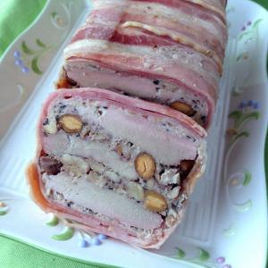 型にベーコンを敷く。ムースを薄く入れ、豚のマリネを入れる。ムースを重ねナッツを散らす。