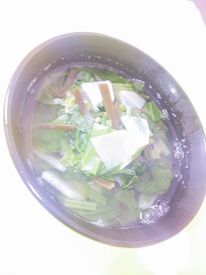 ![]() 1のだし汁に、Aと細切りにした昆布を加え、やわらかくなるまで煮る。(大根、昆布、ほうれん草の順に加える)
